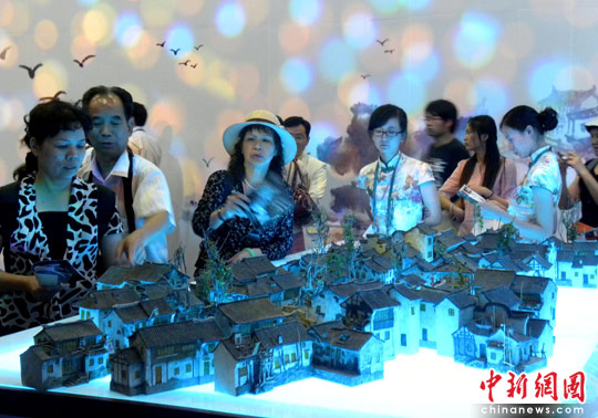 整個案例詮釋了周莊在古鎮(zhèn)保護(hù)、環(huán)境建設(shè)和開發(fā)利用方面的成就,通過視頻演示、活態(tài)表演、水幕浮雕、論壇等多種形式,生動多角度展現(xiàn)“小橋流水人家”的江南獨有風(fēng)韻和美好生活。在約五百平方米的案例展區(qū)內(nèi),分為“中國第一水鄉(xiāng)”、“我愛周莊”、“周莊是國寶”三個篇章。步入展區(qū),就猶如身處一幅緩緩打開的畫卷中:眼前波光流翠、粉墻黛瓦、翠竹搖曳、庭院疊嶂,阿婆茶、手編竹、繡花鞋等手工藝表演盡顯婉約吳地人文風(fēng)情;踏入長廊,煙波浩渺盡收眼底;穿過拱門,臨坐美人靠,古園風(fēng)情、江南田園風(fēng)光旖旎;古戲臺上昆曲表演,水袖飄逸賞目、天籟之音悅耳;虛實結(jié)合的名景雙橋,頭戴斗笠、身著水鄉(xiāng)服飾的江南女子,一切美不勝收。