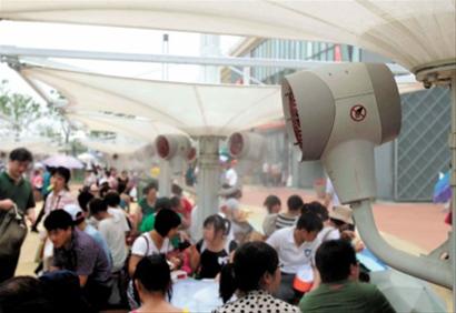上午園區(qū)開放后,記者看到不少游客并沒有急著參觀展館,而是在遮陽棚下的長凳上小憩、喝水、抹防曬露。而撐著遮陽傘排隊(duì)幾乎成為“普遍規(guī)律”,太陽鏡、遮陽帽也成為參觀者的“標(biāo)準(zhǔn)配置”,有些游客甚至帶著濕毛巾擦汗、降溫。園區(qū)內(nèi)的公園、綠地以及多處噴霧、透水地面、遮陽棚等場所、設(shè)施的降溫作用明顯,受到游客歡迎。