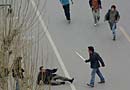 不法分子手持棍棒、匕首準(zhǔn)備圍攻一名摔倒的男子