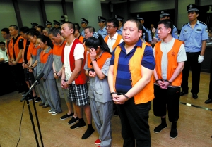 胡毅(前排右一)等18名被告人被帶上法庭。昨日,騙取北京農商行7.08億貸款的嫌疑人庭上受審。本報記者 王貴彬 攝