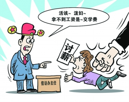 27日,因東莞市東城區(qū)“藏寶國(guó)際大酒店”拖欠裝修工人工資,工人拉橫幅上街討薪,兩工人被不明身份的黑衣人毆打。28日,東城區(qū)政府信訪辦就此舉行協(xié)調(diào)會(huì),會(huì)上工人提及被打一事,主持會(huì)議的信訪辦主任葉柱權(quán)說(shuō)是“活該”,他情緒激動(dòng),拍桌子罵女工人為“潑婦”,稱工人拿不到工資是“交學(xué)費(fèi)”。(相關(guān)報(bào)道見今日A14版)