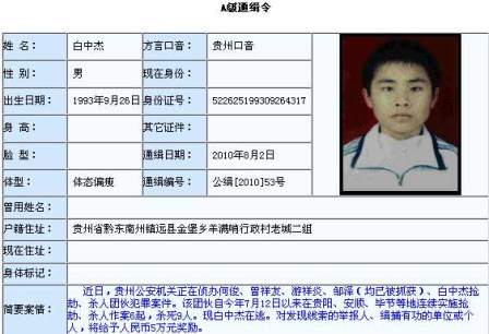 簡介:今年8月2日,公安部發(fā)布A級通緝令,懸賞5萬元緝拿在逃犯罪嫌疑人白中杰,他涉嫌參與一個搶劫、殺人團伙。該團伙自今年7月12日以來,在貴陽、安順、畢節(jié)等地連續(xù)實施搶劫、殺人作案6起,殺死9人。在公安部網(wǎng)站上自2006年1月26日以來公布的25個A級通緝令通緝的犯罪嫌疑人中,白中杰是年齡最小的,是唯一的“90后”。8月4日白中杰被警方抓獲。