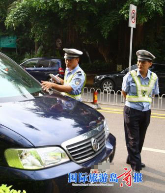 據(jù)在現(xiàn)場(chǎng)的市民李先生介紹,昨日上午,他和朋友開車到古玩一條街閑逛,可因前方堵車,一直無法進(jìn)入,李先生隨即下車走到路口發(fā)現(xiàn),原來有兩輛軍車和一輛省政府公務(wù)車違規(guī)在路邊停車,導(dǎo)致交通堵塞。就在車主們焦急等待的時(shí)候,?诮痪皶r(shí)趕來,疏導(dǎo)了現(xiàn)場(chǎng)的交通后,毫不猶豫地對(duì)這些違規(guī)停車的“特權(quán)車”及其他私家車開出罰單。(國(guó)際旅游島商報(bào) 記者王煥娟特約記者李順成攝影報(bào)道)