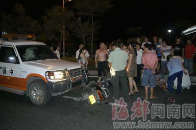 事發(fā)8月17日晚近10時(shí),黃先生說:“太突然了,我一下被撞飛,當(dāng)時(shí)馬上暈過去了!碑(dāng)晚,他和幾個(gè)同事在江濱路大排檔吃完飯后,分乘兩輛摩托車沿江濱路由東往西行駛,他開的摩托車上載著同事周女士。途經(jīng)洋老洲游泳池附近時(shí),黃先生突然感到后面有車撞來,他和周女士被撞倒并被往前面推行了10多米,接著他就暈過去了。
