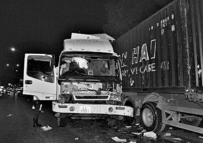 事發(fā)凌晨1時許,一輛密斗貨車由23歲姓陳司機駕駛,載妻子沿屯門公路入屯門。據(jù)現(xiàn)場目擊者稱,該輛貨車行駛時不斷在路面左穿右插爬頭,途至上址失控,撞向前行一輛20呎長、裝滿塑料粒的貨柜車尾部。密斗貨車車頭嚴重損毀,擋風玻璃飛脫;前座女乘客懷疑沒有佩戴安全帶,當場從車頭飛出數(shù)米外墮地,復被密斗貨車卷入車底,左前輪更輾過她左上臂而重傷。