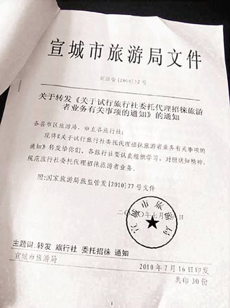 記者向當(dāng)?shù)芈糜螛I(yè)界人士了解了一些情況,據(jù)說整個(gè)宣城市,包括涇縣在內(nèi),沒有一家旅行社具備組織出境游的資格。當(dāng)?shù)芈眯猩缱疃酁楹戏省⒛暇┑鹊芈眯猩缱龃頂埧偷臉I(yè)務(wù)。
