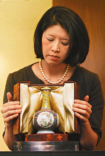 蘇富比中國及東南亞區(qū)副董事沈恩文表示,琺瑯彩搥瓶專為皇室而造,當(dāng)時產(chǎn)量僅有數(shù)百個,現(xiàn)時大部分收藏于北京故宮博物館及臺北故宮博物館,流傳于民間,由私人收藏是很罕見。他說,今次拍賣會有另一個清乾隆制琺瑯彩搥瓶,繪畫的四季花卉品類與焦點珍品相同,構(gòu)圖則有差異,但因為曾作修補(bǔ),非完好無缺,故估價較低,約800萬至1000萬港元。