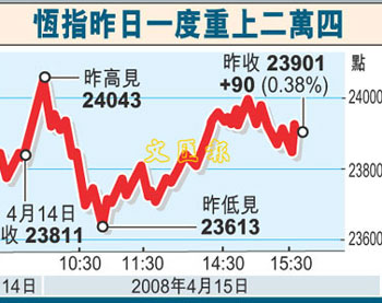 中新網(wǎng)4月16日電 據(jù)香港文匯報報道,大市缺乏方向,港股表現(xiàn)反復。15日大市高開139點后,一度重上24000點關(guān)口,但其后在高位沽壓顯著增加,恒指收市升90點至23901點,成交縮減至714.5億元。分析員指,大市仍未能突破250天線,料短期內(nèi)大市仍在22000-25000點徘徊。