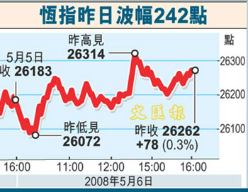 中新網(wǎng)5月7日電 據(jù)香港文匯報報道,港股繼續(xù)牛皮發(fā)展,恒指全日收報26262點,升78點,成交總額進(jìn)一步縮減至702.7億元。證券經(jīng)紀(jì)表示,成交再萎縮,顯示市場買盤乏力,指數(shù)上升只是中移動獨撐大市而已,而且人為因素甚強(qiáng),相信若內(nèi)地或美國一旦有壞消息出臺,恒指將下試25000點支持位。