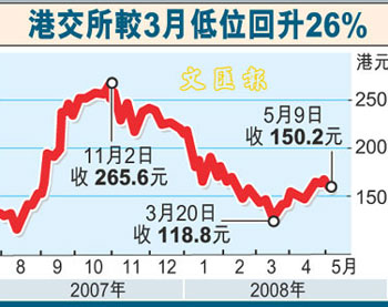 中新網(wǎng)5月13日電 據(jù)香港文匯報報道,市場分析預(yù)計,周三將公布首季業(yè)績的港交所,2008年首季凈利料將強勁增長,凈利料將同比增長56%至84%至14.4億元至17億元。
