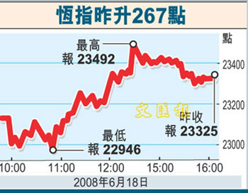 中新網(wǎng)6月19日電 據(jù)香港文匯報(bào)報(bào)道,港股18日在內(nèi)地股市單日轉(zhuǎn)向帶動(dòng)下,加上市場(chǎng)憧憬成品油價(jià)格改革會(huì)有進(jìn)展,刺激中石化及中石油勁升,補(bǔ)倉(cāng)盤涌現(xiàn),恒指收市報(bào)23325點(diǎn)。業(yè)者認(rèn)為,若內(nèi)地股市買盤動(dòng)力持續(xù),中資股在恒指比重已超過(guò)5成,恒指也可望受惠重上24000點(diǎn)關(guān)。