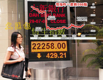 中新網(wǎng)7月30日電 據(jù)香港文匯報(bào)報(bào)道,富昌證券總經(jīng)理藺常念表示,國際貨幣基金會(huì)(IMF)唱淡美國樓市,反映美國樓市問題未解決,加上美林再錄巨虧,需要集資85億美元。若次按問題延續(xù),對(duì)各地股市都會(huì)有所打擊,也會(huì)影響港股表現(xiàn)。他個(gè)人仍維持看淡港股后市的預(yù)測,估計(jì)恒指短期有機(jī)會(huì)下試21000點(diǎn)。