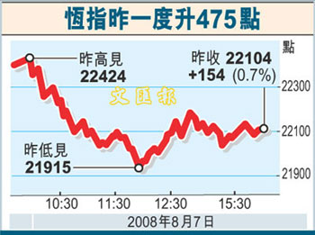 輝立資產管理策略師陳煜強表示,由于全球經(jīng)濟放緩,股市仍未見可突破的機會,加上預期奧運期間,內地不會有新措施出臺,估計恒指短期內只會在22000點左右徘徊。