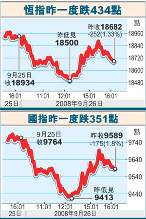 富昌證券總經(jīng)理藺常念表示,美國仍未通過救市方案,中移動(dòng)母公司又被國資委抽走500億元人民幣,令市場失去信心,令中移動(dòng)26日急跌3%。他形容,投資者目前對后市悲觀,紛紛不計(jì)價(jià)格地出貨套現(xiàn),就算內(nèi)地股市跌勢喘定,但美股走勢疲弱下,港股后市絕不樂觀,所以他預(yù)計(jì),大市下周將逐步回落至18000點(diǎn)水平。