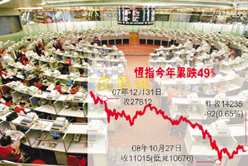 恒指30日收報(bào)14235點(diǎn),今年以來計(jì),跌幅達(dá)49%或13600點(diǎn),以點(diǎn)數(shù)計(jì)是歷年最大,以百分比計(jì)是歷年第二大。受環(huán)球金融海嘯拖累,年內(nèi)市況極為動(dòng)蕩,連強(qiáng)積金也大虧,無論大戶散戶,也不論有否投資股票,人人損失慘重。