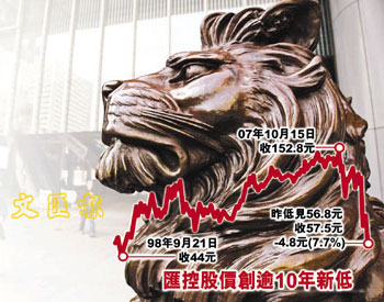 匯控20日在倫敦股市繼續(xù)下挫,中段股價跌逾4%至480便士,相等于51.94港元。于20日晚11時10分,匯控美國預托證券(ADR)折算每股報52.81港元,較香港收市再跌4.69港元,預示匯控21日仍會續(xù)跌。