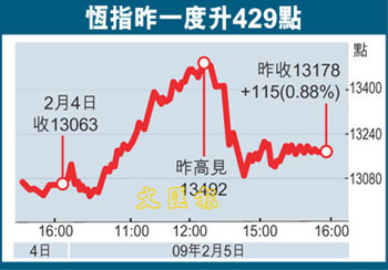 中新網(wǎng)2月6日電 據(jù)香港《文匯報(bào)》報(bào)道,雖然周三美股跌121點(diǎn),但港股5日在中資股,特別是中資金融股的推動(dòng)下,曾升429點(diǎn),收?qǐng)?bào)13178點(diǎn),升115點(diǎn)或0.88%,成交額較4日激增近50%至528.32億元,為今年1月中以來最多。