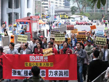 中新網(wǎng)2月9日電 據(jù)香港《大公報(bào)》報(bào)道,香港電盈小股東大聯(lián)盟8日舉行大游行,促請(qǐng)證監(jiān)會(huì)盡快徹查電盈懷疑“種票”事件,約百名電盈小股東出席。
