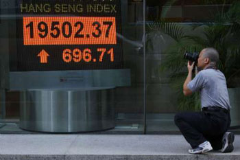香港股市20日跟據(jù)外圍高開200點(diǎn),輕易升破19000點(diǎn)關(guān)口拾級(jí)而上,中午收市升447點(diǎn),在深滬股市推波助瀾之下,港股午市升勢(shì)持續(xù)擴(kuò)大,最多升700點(diǎn),金融股及地產(chǎn)股齊齊為股市添動(dòng)力,指數(shù)以接近全日高位收市,報(bào)19502點(diǎn),上升696點(diǎn)或3.7%,多只藍(lán)籌股重返去年由雷曼爆煲引發(fā)的金融海嘯前水平,國企指數(shù)升幅超過4%或446點(diǎn),收市報(bào)11593點(diǎn)。