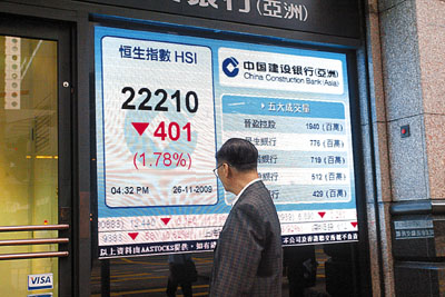 中新網(wǎng)11月27日電 據(jù)香港《文匯報》報道,市場擔(dān)心若迪拜世界一旦破產(chǎn),會令多間主要借款銀行,包括匯控在內(nèi)的歐洲大型銀行需要大額撇帳。亞太區(qū)股市普遍走弱,內(nèi)地及港股也不能幸免,恒指26日曾跌500點(diǎn),尾市跌幅略收窄,但也跌401點(diǎn),收22210點(diǎn),跌幅1.78%,成交773億元。