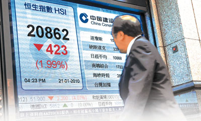 中新網(wǎng)1月22日電 據(jù)香港《文匯報(bào)》報(bào)道,內(nèi)地去年超額完成“保八”目標(biāo),12月居民消費(fèi)價(jià)格指數(shù)(CPI)漲幅更大升至1.9%,超出市場(chǎng)預(yù)期,投資者擔(dān)心內(nèi)地將提早加息,并加快退市步伐,加上隔夜美股疲弱、希臘財(cái)政問(wèn)題或擴(kuò)散至葡萄牙令美元急升,資金撤港匯弱,種種因素令港股21日再大跌423點(diǎn)或2%,失守21000點(diǎn),大市兩天共瀉815點(diǎn)。
