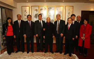24日香港寒風(fēng)凜凜,但國(guó)學(xué)大師饒宗頤位于跑馬地的居所愛(ài)賓室里,卻洋溢著暖暖春意。陳進(jìn)玉一行帶著溫家寶總理和國(guó)務(wù)委員馬凱的新春祝福,以及親筆簽名的新春賀卡,在傳統(tǒng)新春佳節(jié)到來(lái)前夕,專(zhuān)程來(lái)港探望饒宗頤。小小會(huì)客室賓朋滿(mǎn)座,歡聲笑語(yǔ)不絕于耳,與墻上的饒老得意之作愛(ài)賓室題字相映成趣。