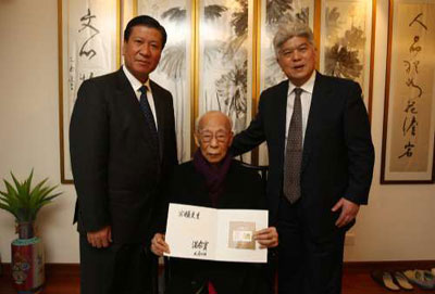陳進(jìn)玉代為轉(zhuǎn)交這份千里之外的濃濃祝福,饒老接在手中,凝神細(xì)望,若有所思,笑得開(kāi)懷:“虎年,好年”。陳進(jìn)玉轉(zhuǎn)達(dá)了溫總理的新春?jiǎn)柡。他說(shuō),饒宗頤先生為弘揚(yáng)中華民族優(yōu)秀傳統(tǒng)文化、促進(jìn)國(guó)家文化建設(shè)提出了許多寶貴意見(jiàn)。去年初饒老獲溫總聘任,擔(dān)任中央文史研究館館員,當(dāng)?shù)弥埨媳M管年事已高,仍關(guān)注國(guó)家文化建設(shè)時(shí),溫總深受感動(dòng),也十分關(guān)心饒老的健康和生活,百忙之中,仍將饒老安康緊系心頭。