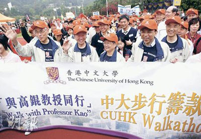 中大14日舉行“與高錕教授同行”籌款日,開步禮除了有高錕伉儷為主角外,中大多名重量級人士,包括校董會主席鄭海泉、兩位前任校長馬臨及金耀基也有參加,現(xiàn)任校長劉遵義也與新婚太太麥嘉軒十指緊扣一同步行。