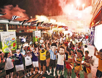 中新網(wǎng)6月12日電 “開波了﹗”香港球迷引頸待盼4年的世界杯昨晚正式揭幕,全城“熱爆”,熱舞狂歡處處,儼如嘉年華,商場(chǎng)、酒吧以至餐廳食肆變身“球迷樂園”,不分男女,不論是哪一隊(duì)的球迷,觀眾情緒同樣高漲,氣氛熱鬧。未來一個(gè)月,無論你是否球迷,相信也無法抵擋這股熱潮。