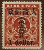 這枚紅色印花郵票是清朝人用作繳交關稅的三分稅票,但國家郵政成立初期未有足夠郵票使用,在稅票蓋上一元,當作郵票。