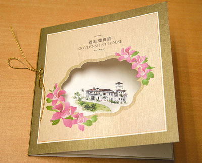 該賀卡由特區(qū)政府新聞處設(shè)計(jì),封面是香港市花洋紫荊襯托下的禮賓府全景油畫,卡內(nèi)寫上“恭賀新禧”及“Wishing you a Happy and Properous New Year”,并由曾蔭權(quán)簽名,誠意十足。