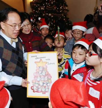 曾蔭權(quán)伉儷24日在禮賓府舉行了一個(gè)圣誕派對(duì),邀請(qǐng)40多位來(lái)自深水埗的小學(xué)生,擔(dān)任他的特別嘉賓,一同歡度一個(gè)溫馨愉快的早上。曾蔭權(quán)在博客中透露,自己與小朋友在圣誕樹前大合照,他們又送其一張巨型的圣誕卡,里面全是他們可愛的簽名和祝福,其中一句“祝你長(zhǎng)命一點(diǎn)”更是“搶眼”:“小孩的直率和可愛,令我不禁失笑!