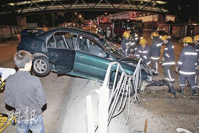 最新一宗懷疑索K后駕駛事故在26日凌晨約1時(shí)50分發(fā)生。29歲梁姓男子駕駛私家車沿窩打老道往獅子山隧道行駛,途經(jīng)窩打老道113號(hào)九龍?zhí)習(xí)䦟?duì)面時(shí)突然失控,撞毀路中鐵欄,車身擱在石欄上,車頭嚴(yán)重?fù)p毀,前半車身更沖入對(duì)行線,車尾懸空。