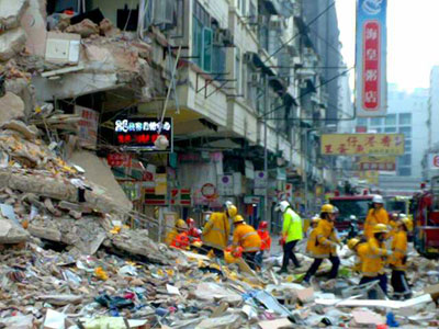 土瓜灣馬頭圍道一幢樓宇整幢倒塌,消防員架起云梯從旁邊大廈救出被困居民。消防員首先為居民綁上安全帶,然后逐個(gè)居民由云梯救落地面。
