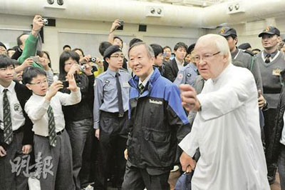 身穿藍色外套、系上母校領(lǐng)帶的高錕,7日出席母校圣若瑟書院成立135周年開放日開幕典禮。精神飽滿的高錕在全場熱烈掌聲下,由校監(jiān)湯瑪士修士陪同進入禮堂,太太黃美蕓則拉著高錕的外套,緊隨其后進場。