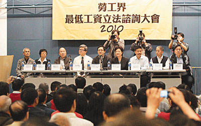 大會(huì)向所有與會(huì)者派發(fā)問卷,收集他們對(duì)最低工資水平、用膳時(shí)間應(yīng)否計(jì)算入最低工資之內(nèi)、工資水平應(yīng)否每年檢討等的意見,并由工聯(lián)會(huì)議員潘佩璆簡(jiǎn)介最低工資立法進(jìn)度,繼由勞工顧問委員會(huì)勞方代表梁籌庭講述勞顧會(huì)對(duì)此項(xiàng)議題的最新進(jìn)展,再由與會(huì)人士自由發(fā)言。