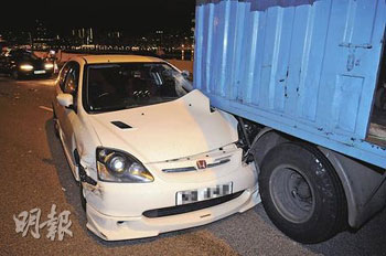 逾20輛經(jīng)改裝的私家車,13日凌晨在被視為香港熱門非法賽車“跑道”之一的觀塘繞道,以160公里時速狂飆。警方接報趕至,并事先在繞道上截停5輛普通市民的車輛,作為堵截非法賽車的路障。未幾,10多輛跑車陸續(xù)高速馳駛沖過防線,另有最少3車實時掉頭逆線逃去,而5輛被充作“人肉路障”的汽車頓成犧牲品全被撞毀。有挨撞的士司機不滿警方做法,即場指斥“沒有理由要我們充當‘人肉沙包’!”。
