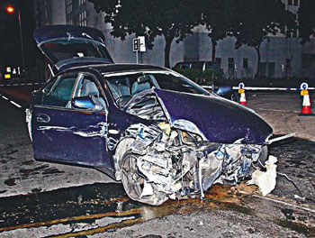 私家車突圍逃出后,至安全街時(shí)警車追至,私家車倒車連撞警車三次,在安全街加速疾馳,但失控撞毀路邊三個(gè)石欄繼而反彈路中,車頭盡毀無(wú)法開動(dòng)。