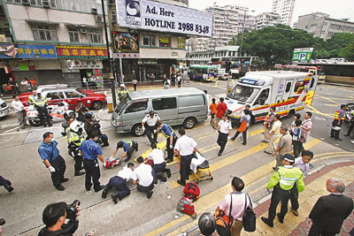 另外,一對(duì)來港探親、上了年紀(jì)的內(nèi)地姐弟,昨天上午11時(shí)45分在旺角染布房街近亞皆老街交通燈路口橫過南行線馬路時(shí),1輛沿亞皆老街東行客貨車右轉(zhuǎn)入染布房街,弟及時(shí)閃避, 68歲陸姓老婦卻被客貨車撞個(gè)正著,當(dāng)場(chǎng)飛彈數(shù)呎倒地,頭破血流昏迷,送院情況危殆。肇事客貨車黃姓30歲司機(jī)事后在場(chǎng)助查,警方正調(diào)查是否有人不遵照交通燈號(hào)導(dǎo)致意外。