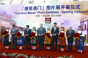 圖片展30日上午9時半在天津博物館開幕,澳門社會文化司司長崔世安,中聯(lián)辦經(jīng)濟(jì)部長周志奎,旅游局長安棟梁,天津市旅游局副局長金鐵林、佟景正等主持開幕儀式。圖片展為期1周,展出20多幅充滿澳門特色的圖片。