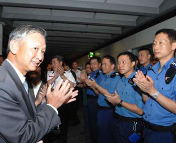 中新網(wǎng)5月23日電 據(jù)香港大公報(bào)報(bào)道,參與四川大地震搜救工作的香港搜救隊(duì)成員,22日晚自成都返港,獲得英雄式的歡迎。香港保安局局長(zhǎng)李少光在歡迎式上致詞,盛贊各人表現(xiàn)英勇和專業(yè),不畏艱辛的無(wú)私奉獻(xiàn),令港人感到驕傲。儀式完成后,隊(duì)員上前輕吻妻兒,更有人不禁流下男兒淚。