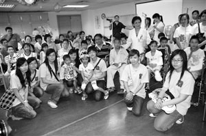 圖:代表團(tuán)一行與在穗治療的災(zāi)區(qū)兒童合影。(圖片來(lái)源:澳門日?qǐng)?bào))