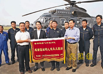 中新網(wǎng)6月6日電 據(jù)香港文匯報報道,一直在四川執(zhí)行飛行救援任務的香港飛行服務隊在向清平災區(qū)運送完1.2噸物資后,救援工作暫告完成。據(jù)統(tǒng)計,飛行隊在過去20天成功救出96名受困災區(qū)民眾。四川省人民政府5日在廣漢機場特贈錦旗以表彰飛行隊在川的優(yōu)異表現(xiàn)。
