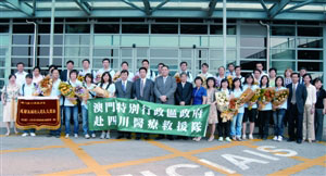 四川汶川大地震后,由澳門特區(qū)政府派出的第二支醫(yī)療隊(duì)21名醫(yī)療志愿人員,23日完成在南充市中心醫(yī)院的支持工作,并于下午4時(shí)20分飛返澳門。社會(huì)文化司司長(zhǎng)崔世安、中聯(lián)辦文教部部長(zhǎng)劉曉航、衛(wèi)生局長(zhǎng)李展?jié)櫋㈢R湖醫(yī)院慈善會(huì)秘書長(zhǎng)吳培娟,以及澳門多個(gè)醫(yī)護(hù)團(tuán)體負(fù)責(zé)人到機(jī)場(chǎng)迎接。