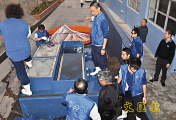 根據初步檢查結果,兩尾鱘魚不僅體內有炎癥,體外也有不少擦掛傷口。專家會診后制定了“針療+藥物潑灑+水質調整”三路并進的治療方案,一方面按照每周兩次的頻率為鱘魚注射抗生素等針劑,同時每周向繁育池中潑灑2至3次調配好的粉狀藥物,主要功效都是消炎;刈顬榫o張的水質檢測,則指派專人負責每日抽樣送檢。