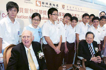 香港中大及新鴻基地產(chǎn)昨日第八度舉辦“新鴻基地產(chǎn)諾貝爾獎(jiǎng)得獎(jiǎng)學(xué)人杰出講座系列”,今年邀請(qǐng)兩名諾貝爾物理學(xué)獎(jiǎng)得主楊振寧和馬丁•佩爾出席講座,與百多名學(xué)生真情對(duì)話。有學(xué)生提到香港與美國(guó)學(xué)生的分別時(shí),楊振寧指美國(guó)與香港的教學(xué)哲學(xué)距離甚大,香港學(xué)生由小學(xué)、中學(xué)開始便會(huì)操練數(shù)學(xué),數(shù)學(xué)較理想。他又推薦年輕人閱讀《雙螺旋》,故事講述一名年輕人努力不懈,最后成功發(fā)表“雙螺旋”理論,獲得諾貝爾生物獎(jiǎng)。