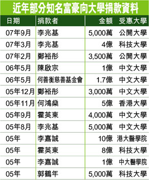 近年在股市斬獲甚豐的李兆基,今年多次捐款予香港大學(xué),他先在三月捐出四億元予香港科技大學(xué),九月再捐款五千萬元予香港公開大學(xué)!鹞迥辏杩罱o港大興建學(xué)生宿舍,日前再向該校捐出五億元,港大將以一半金額成立獎(jiǎng)學(xué)基金,其余二億五千萬元?jiǎng)t作為校園發(fā)展用途。若計(jì)算港大今次獲得的捐款,李兆基近年已捐出約十一億元予香港大學(xué),但香港教育學(xué)院暫時(shí)未有受惠。