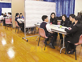 中新網(wǎng)1月14日電 升中學(xué)面試對(duì)香港小學(xué)生而言,有著舉足輕重的影響,故有小學(xué)日前舉行大型模擬面試,約50名高小學(xué)生家長(zhǎng)搖身變成威嚴(yán)十足的面試官,以流利的兩文三語考核學(xué)生,協(xié)助近170名小六生預(yù)演氣氛緊張的升中面試。有學(xué)生早在1周前已認(rèn)真準(zhǔn)備,把握練習(xí)機(jī)會(huì),全力爭(zhēng)取入讀心儀英文中學(xué)的機(jī)會(huì)。