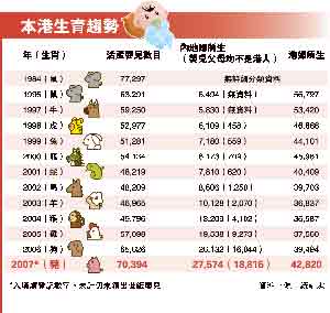 據(jù)香港明報(bào)報(bào)道,2007年醫(yī)管局共錄得39,182名新生嬰數(shù)字,醫(yī)管局總行政經(jīng)理鄭信恩說,雖然傳統(tǒng)上生仔旺季一向在9月至11月,但今年首個(gè)半月公立醫(yī)院生產(chǎn)個(gè)案,已明顯較去年同期上升,“去年經(jīng)濟(jì)好,市民積極想生育多點(diǎn),估計(jì)今年生育也會(huì)多,新生嬰應(yīng)會(huì)超過去年!