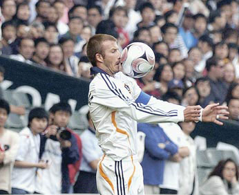 在上海站拉傷右腿的貝克漢姆9日仍以正選上陣,踢足90分鐘,包辦所有角球及罰球,也不時在右路施展“七旋斬”威力,每逢貝克漢姆一拿球,即引來球迷狂呼,有的更大喊“David!David!”。